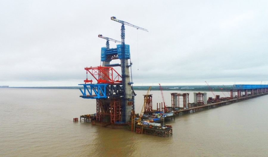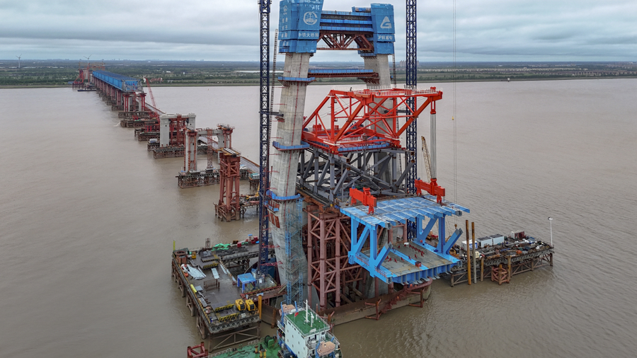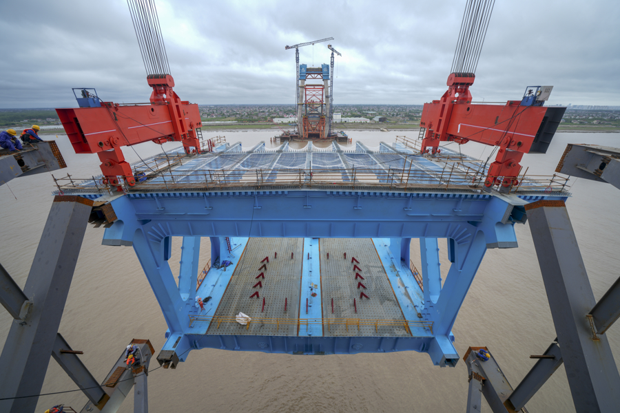 6月8日,随着挂篮吊机将重约900吨的上海侧首吊A01A02节段平稳落在钢梁支架上,崇启公铁长江大桥主通航孔桥首吊钢梁顺利架设完成,为大桥在预定时间内建成通车奠定坚实基础。
