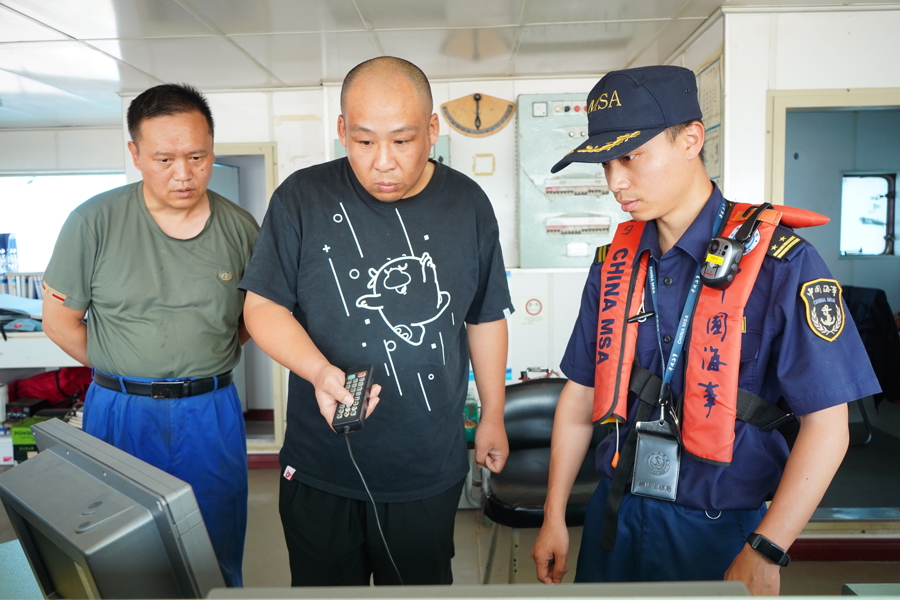 在作业前期,崇明海事局对参与施工作业的船舶进行覆盖检查,重点关注船舶的动力系统、导航仪器、消防救生设施等关键设备,并对货物的绑扎系固情况进行了细致检查,确保船舶适航,货物适载。作业期间,执法人员驾驶巡逻艇在施工水域周边进行巡航值守,及时清离无关船舶,避免对施工造成影响;同时,利用高频和广播系统对过往船舶发布安全信息,提醒船舶注意避让。