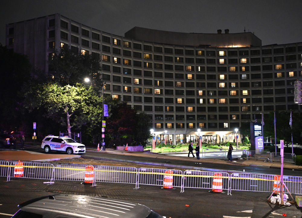 4月25日,举行白宫记者协会晚宴的华盛顿希尔顿酒店前拉起路障。新华社记者李睿摄